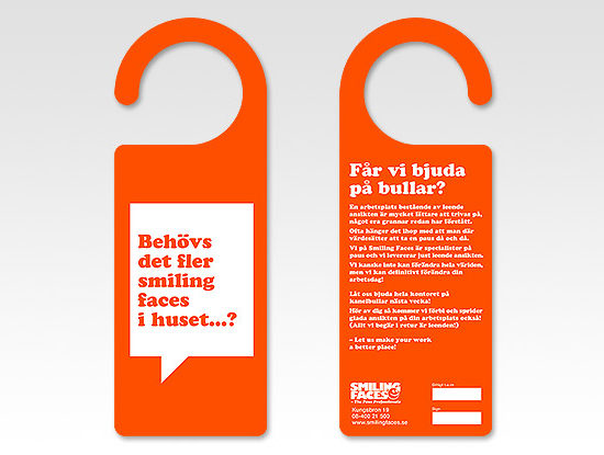 Digitalt offsettryckt dörrhängare till Smiling Faces tryckt med orange Pantonefärg i vår HP Indigo-press. Stansad efterbehandling. Läs mer om Smiling Faces...