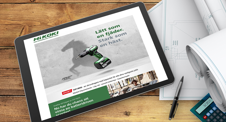 Hikokis kampanjsida för deras borrskruvdragare DS18DD. Sidan innehåller en tävlingskampanj för kunder som har köpt en eller flera skruvdragare av aktuell modell. Kunder kan på kampanjsidan registrera köp och då delta i tävlingen för att kunna vinna en elscooter. PÅ Media har skapat webbdesign och driftar kampanjen på en databasstyrd plattform.