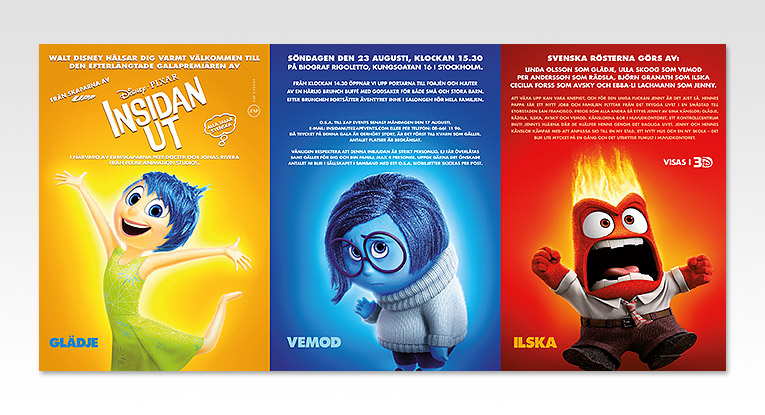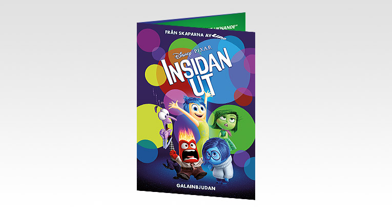 PÅ Media tryckte inbjudan, i form av en rullfalsad folder med blanklaminerad utsida, till galapremiären för den animerade filmen Insidan Ut.