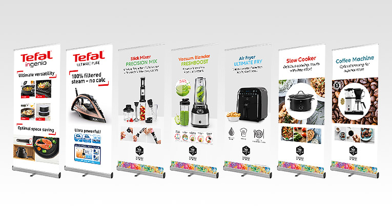 Butiksmaterial i form av Rollups till OBH Nordica och Tefal.